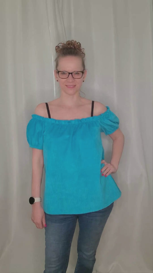 Carmenbluse kurze Puffärmel Punkte Babyblau Marine