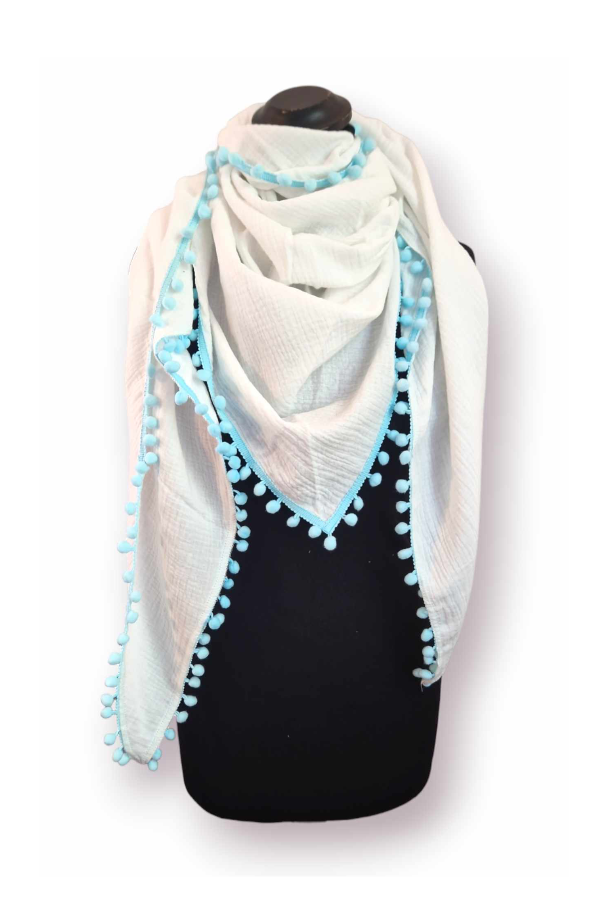Musselintuch Dreiecksformat mit Bommelborte Weiss/Hellblau